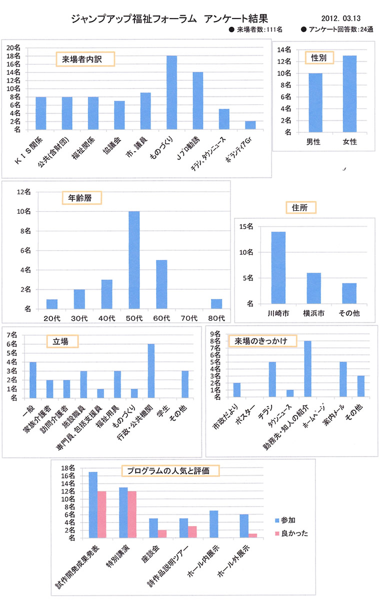 12:00 試作開発品・かわさき基準認証福祉製品・関連福祉機器展示 ~20:00 ~利用者の自立を助け、介助者の負担を軽減する福祉機器の展示~ 14:00 主催者あいさつ 川崎商工会議所企画広報部 (川崎市地域雇用創造推進協議会事務局) 14:10 成果発表「かわさきJプロジェクト平成23年度試作開発福祉機器」 ~福祉現場のニーズから生まれた福祉機器のプレゼンテーション~ 事業説明/電話集音器・移動補助具・ブレーキ改良歩行車・便座離座センサー・おむつ交換カート 詳細はこちら>> 15:30 特別講演「“おむつゼロ”が介護を変える!」 ~どうやっておむつを外すことができたのか? それを助けた“トイレでふんばる君”の開発~ 講師:特別養護老人ホーム世田谷区立きたざわ苑施設長 岩上広一氏 詳細はこちら>> 16:30 試作品説明ツアー 開発担当者がご説明します 17:40 座談会「真に望まれる福祉機器・福祉サービスの開発から普及まで」 ~福祉現場のニーズを製品に結びつける福祉コーディネートの意義~ 出席者:きたざわ苑施設長 岩上広一氏 (株)伊吹電子代表取締役 松田正雄氏 ベクトル(株)代表取締役 小山久枝氏 座長:横浜市総合リハビリテーションセンター地域リハビリテーション部研究開発課長 飯島浩氏 詳細はこちら>> 19:00 閉会のあいさつ 川崎市経済労働局労働雇用部 (川崎市地域雇用創造推進協議会事務局) 19:10 試作品説明ツアー 開発担当者がご説明します 20:00 閉場 ◇